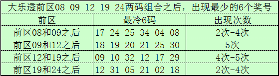 前区两码08和09开出之后,弘扬最冷的6个号码为:17、24、25、34、04、08;